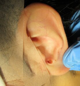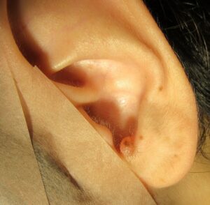 今回のお写真は耳の穴(外耳道)の出入り口のホクロの剥ぎ取り法の1年8ヶ月目の経過のものです。