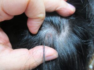 ↓3週間目 まだかさぶたが髪の毛にこびりついていますがこの時点でもすでに経過がよいのが分かります